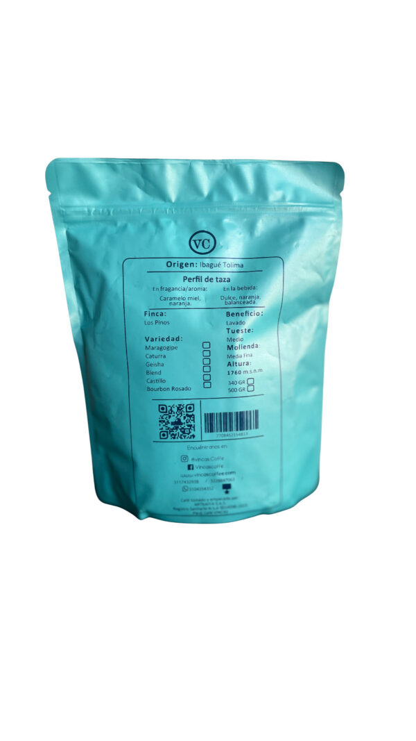 Blend de café de la variedad castillo y tabi, finca los pinos municipio de Cunday-Tolima, productor Juan Camilo Vincos Carrillo, con 0% de acrilamida, perfil de taza suave con aroma y fragancia pronunciadas, cuerpo medio bajo, acidez media con notas frutales, altura 1800 m.s.n.m. elaborado por manos campesinas.